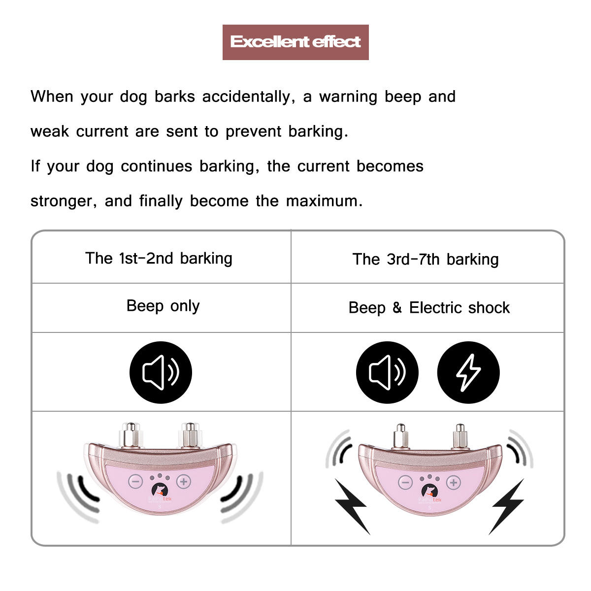 4)The same training will continue 7 times. The first and second times are only alarm sound, and if the dog continues barking, it will trigger the third and seven times alarm static shock. The static shock intensifies every time in order to correct. Don’t worry and the static shock won’t hurt the dogs .
