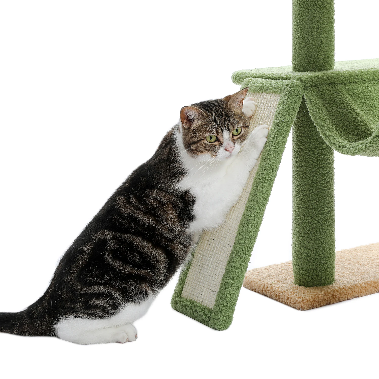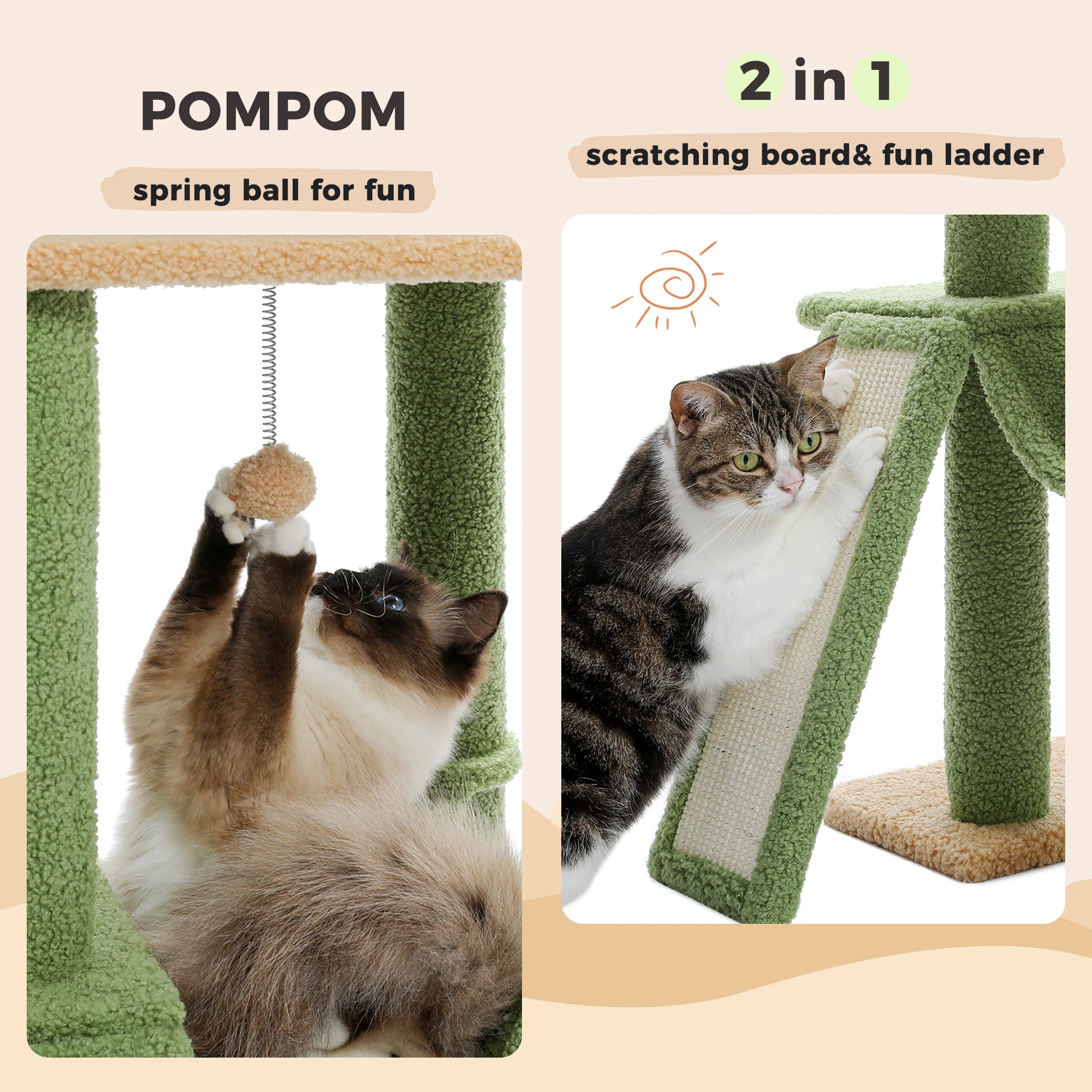 3. Seven levels, four jumping platforms, two capacious hammock, more sisal-covered rope scratching post, one cat scratchers and dangling ball. Meet your cat's daily needs. Suitable for 4-6 kittens at the same time.